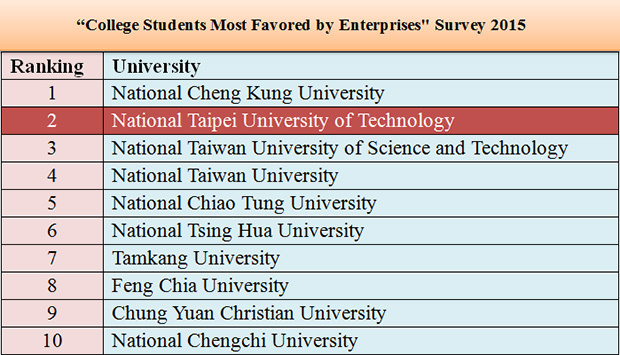 Taipei Tech jumped to 2nd place in this year's “College Students Most Favored by Enterprises" survey conducted by Eastern Online and Global Views Magazine.